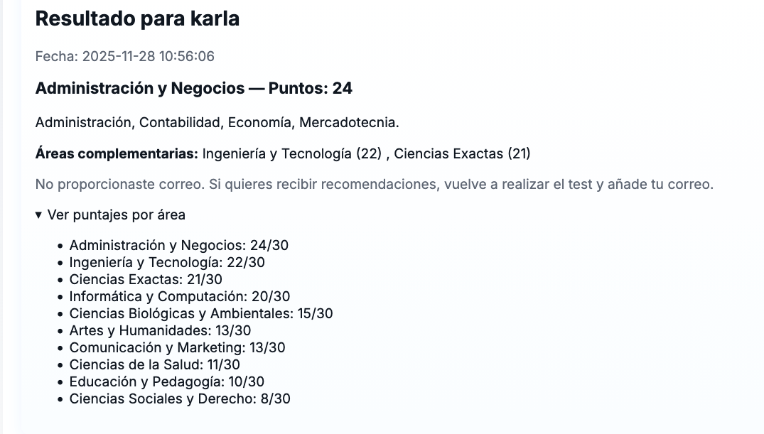 - Recomendación personalizada de carreras acorde a tus resultados.